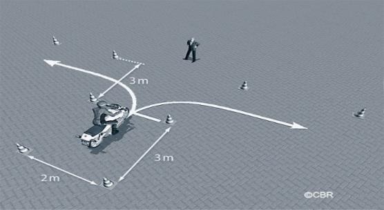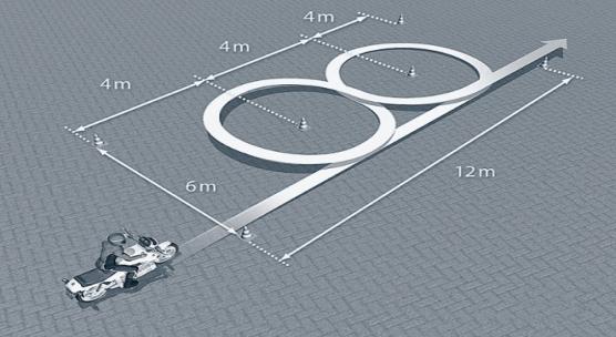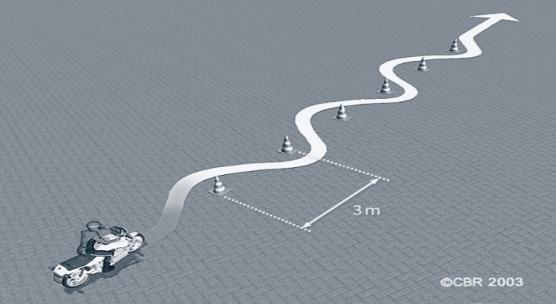- De bestuurder rijdt in een slalom (bochten links- en rechtsom) tussen alle pylonen door. De examinator Iet voornamelijk op het in balans houden van de motor in combinatie met een juiste bediening.