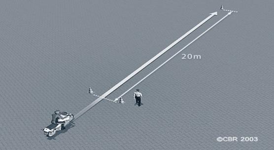 - De bestuurder rijdt stapvoets in een rechte lijn. De examinator let voornamelijk op snelheid, balans en een juiste bediening.